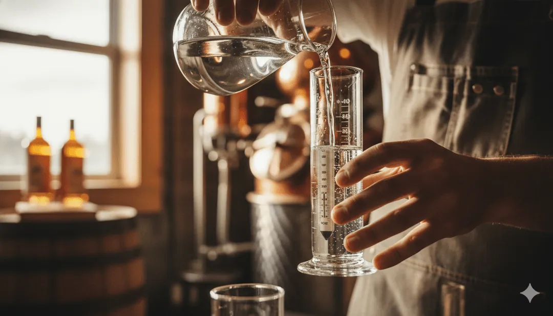 Avant l’embouteillage, l’Acerum est dilué avec une eau pure afin d’ajuster sa concentration alcoolique tout en préservant son profil aromatique.